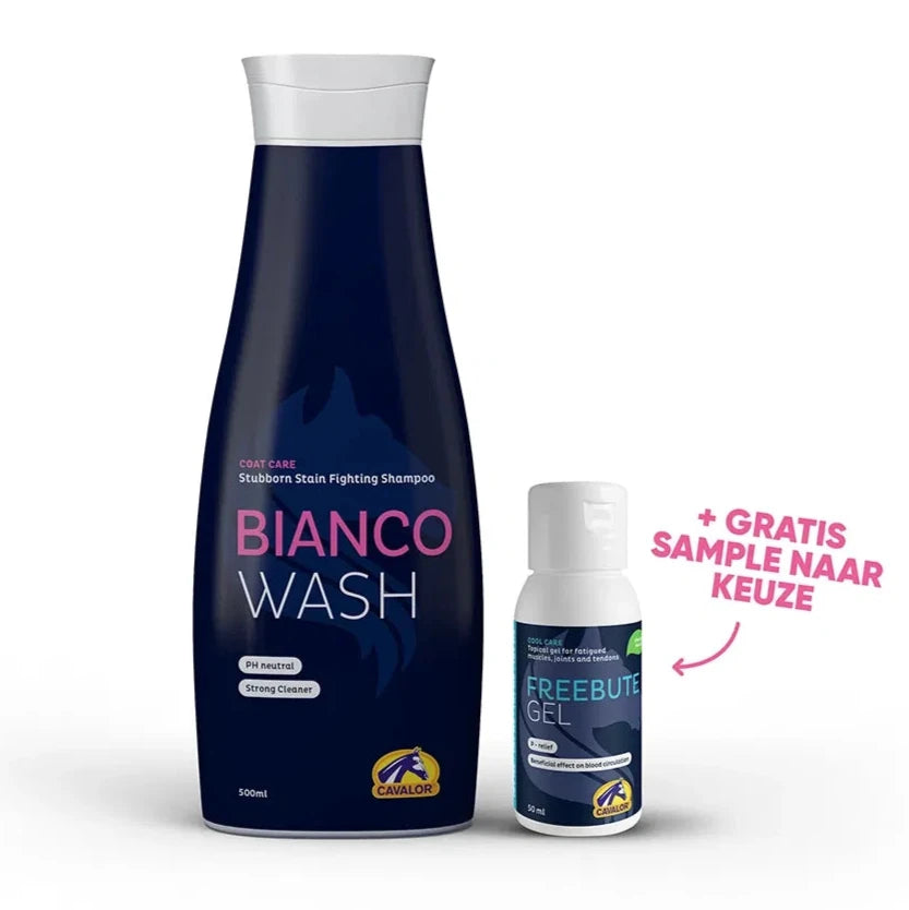 White horses are beautiful, but keeping them sparkling white isn't always easy. With Cavalor Bianco Wash and Bianco Spray, white truly becomes white again. Even stubborn grass, manure, and urine stains on white legs or other coat colors disappear quickly and easily. Cavalor Bianco Wash is a powerful, concentrated shampoo. A small amount is enough to remove stubborn stains from your (white) horse's coat. You can use it by adding a small amount to a bucket of water, or directly on the stain for a stunning result. Don't have the time or inclination to thoroughly wash your horse, but still want it to look its best? Cavalor Bianco Spray is your best friend. For that missed manure stain while grooming or when there's no water nearby, the spray works quickly and effectively. It's also ideal in winter when you prefer not to wash your horse with cold water. All you need is Cavalor Bianco Spray and a dry cloth, and those stains will be gone in no time.